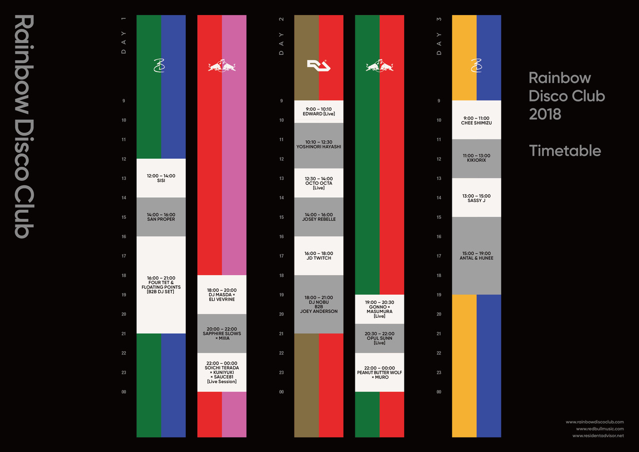 ”RAINBOW DISCO CLUB 2018”のフルラインナップ/タイムテーブル/そして今年も大傑作といえるティザームービーが公開された。既にアナウンスされているヘッドライナー”Four Tet × Floating Points” ”DJ Nobu × Joey Anderson” ”Peanut Butter Wolf × MURO”などに続き、今回、新たに11組の追加アーティストが一挙に追加発表。